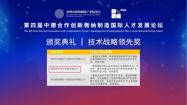 1月6日,由深圳市微納制造產(chǎn)業(yè)促進(jìn)會(huì)、德國聯(lián)邦經(jīng)濟(jì)發(fā)展和對外貿(mào)易聯(lián)合總會(huì)(BWA)聯(lián)合主辦,西麗湖人才服務(wù)中心承辦的“第四屆中德合作創(chuàng)新微納制造國際人才發(fā)展論壇”于深圳順利舉行,論壇圍繞微納制造技術(shù)產(chǎn)業(yè)化、國際合作、科創(chuàng)人才發(fā)展等話題進(jìn)行了演講和探討。在“微納制造技術(shù)產(chǎn)業(yè)化優(yōu)秀案例評選”中,進(jìn)芯電子榮獲“技術(shù)戰(zhàn)略領(lǐng)先獎(jiǎng)”。