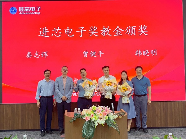 湖南進芯電子科技有限公司副總經(jīng)理周良業(yè)宣讀了2022年湖南大學“進芯電子獎教金”獲獎老師名單,進芯電子黃嵩人、周良業(yè)、陳迪平為獲獎老師頒獎,并送上了祝賀鮮花。