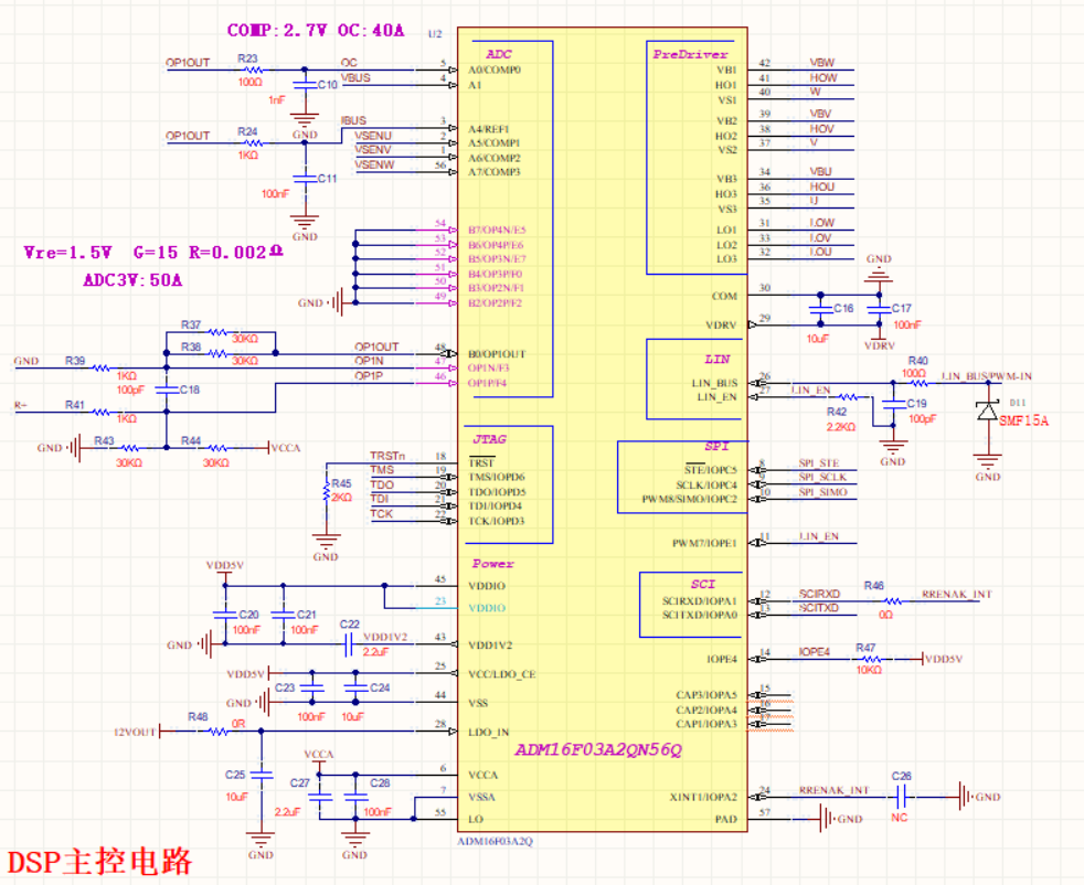 電路模塊主要包括: 輸入防反及濾波電路部分、24V轉(zhuǎn)12V系統(tǒng)供電電路(24V方案)、ADM16F03A2最小系統(tǒng)、功率橋電路、ADC母線電壓采樣電路、單電阻采樣運放采樣電路、自舉電路和PWM/LIN通訊反饋電路。