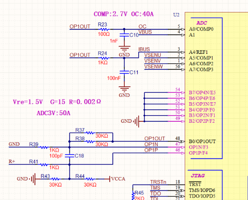 單采樣電阻0.001R/0.002R,通過差分走線至ADM16的OP1的獨立運放電路進行運放輸入到芯片口采樣進行運算。