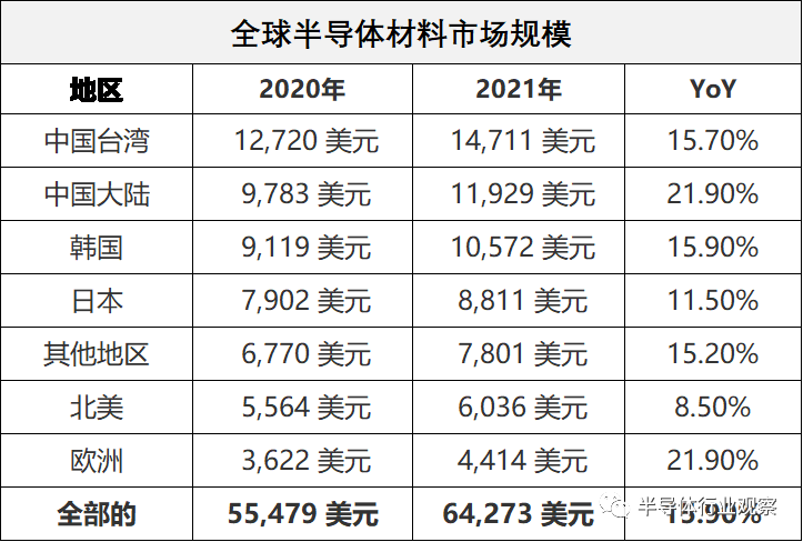 其中,中國大陸2021年半導(dǎo)體材料的市場約為119.3億美元,同比增21.9%。