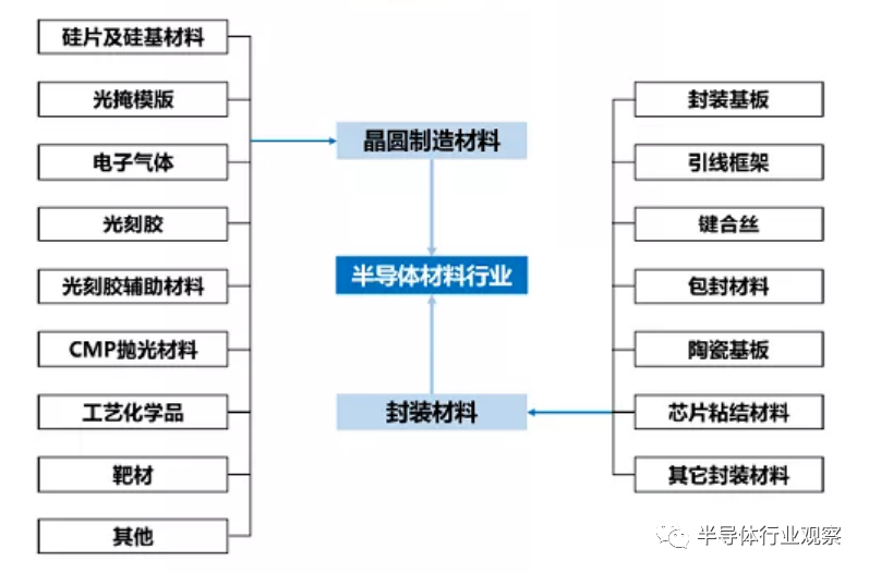 在晶圓制造工藝中,主要用料為硅片、靶材、拋光材料、光刻膠、高純化學(xué)試劑、電子特氣和化合物半導(dǎo)體,其中,硅片、電子特氣、光掩膜版、拋光材料等用量較大;在封裝測試中,主要材料為封裝基板、引線框架、陶瓷封裝體和鍵合金屬線,其中,封裝基板、鍵合絲等是較為主要的材料。