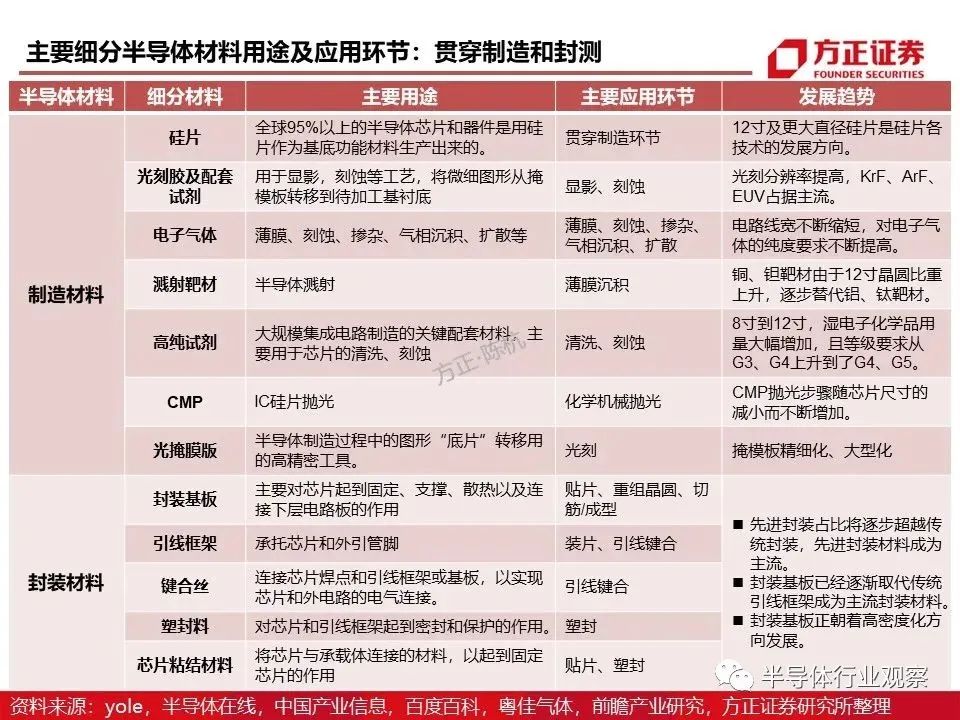 主要細(xì)分半導(dǎo)體材料用途及應(yīng)用環(huán)節(jié)