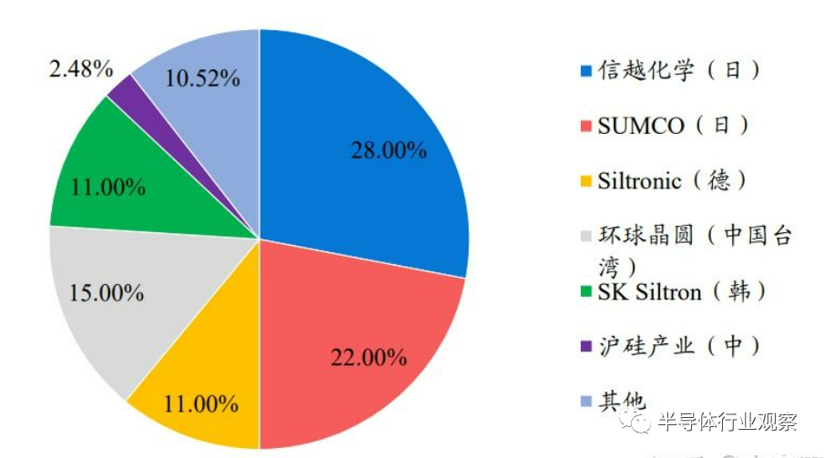 在硅片市場中,日本信越化學(xué)占比28%,SUMCO占比22%,中國臺灣的環(huán)球晶圓占比15%,德國Siltronic占比11%,韓國SK Siltron占比11%。前五大廠商共占據(jù)87%的市場份額,細(xì)分市場集中度較高。