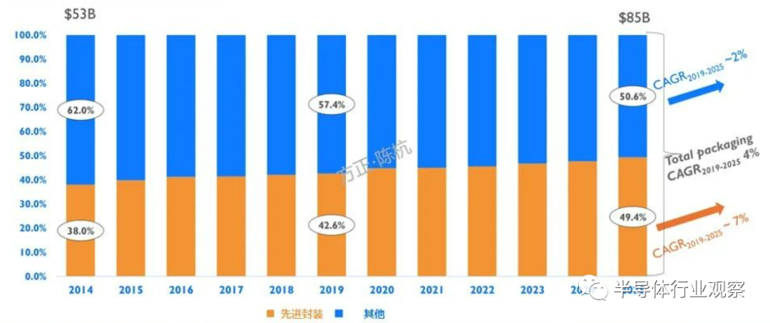 近年來在電子基板中,高密度多層基板占比越來越大,在先進(jìn)封裝中的運(yùn)用越來越廣泛。根據(jù)Yole數(shù)據(jù)顯示,全球封裝收入年復(fù)合增長率為4%,其中先進(jìn)封裝市場的年復(fù)合增長率達(dá)7%,預(yù)計(jì)到2025年先進(jìn)封裝收入將達(dá)到422億美元,封裝市場占比接近50%。