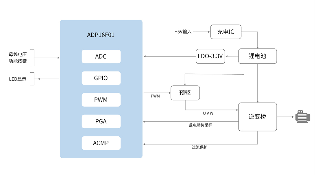 本方案是基于進(jìn)芯16位DSP ADP16F01開發(fā)的,充分發(fā)揮了ADP16F01的算力、資源、成本等優(yōu)勢。整個系統(tǒng)結(jié)構(gòu)簡單,采用無感方波控制算法,能夠?qū)崿F(xiàn)筋膜槍的穩(wěn)定啟動和運行,通過設(shè)置不同的限流點可以實現(xiàn)對的力道大小的調(diào)節(jié);擁有堵轉(zhuǎn)卸力,快速充電,動力強勁等功能。