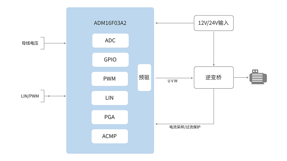 該方案采用自研無感單電阻FOC算法,具備母線電壓ADC檢測,可通過PWM/LIN進行控制不同的轉速及故障反饋功能;具有順逆風啟動,噪聲小,波形控制穩(wěn)定等特點