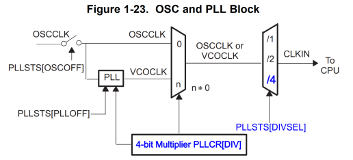 此時(shí)程序的PLLSTS[8:7].DIVSEL=10b (0x0101); PLLCR[].DIV=1100b (0x000C); 根據(jù)sprui10.pdf資料page70 Figure 1-23所示,為OSCCLK的12倍頻,2分頻。