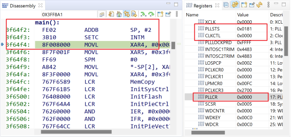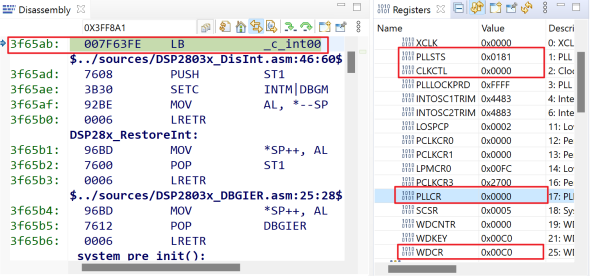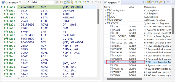 4、為了預(yù)防上述事件發(fā)生,在CPU Reset后,PC指向3ff8a1時(shí),手動(dòng)在Registers窗口設(shè)置SYSCTRL.PLLCR=0; 再往下執(zhí)行程序,可預(yù)防部分DSP主頻無(wú)法達(dá)到120M時(shí)產(chǎn)生的燒錄異常。