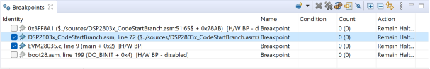 步驟如下圖,在CodeStartBranch.asm中_c_int00和 main() 函數(shù)處設(shè)置斷點(diǎn),觀察運(yùn)行情況。