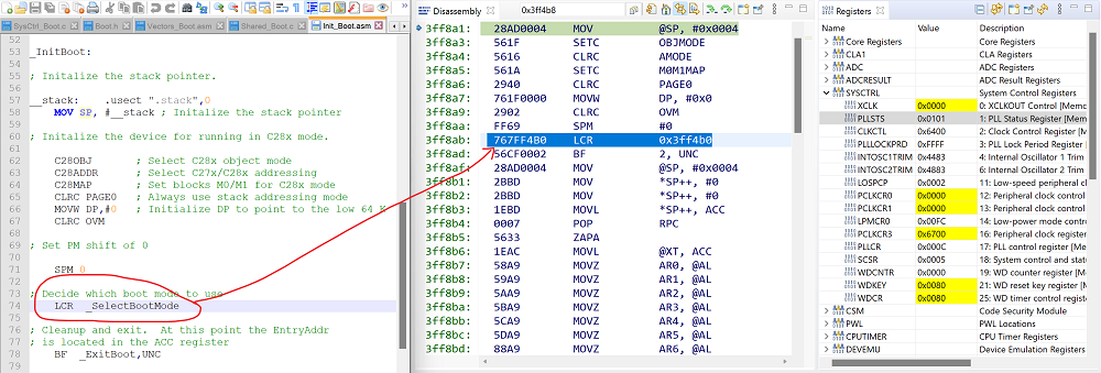 2、3ff8a1的起始位置即BOOT ROM中InitBoot()函數(shù)入口,當(dāng)函數(shù)進(jìn)入到SelectBootMode()時(shí),程序會(huì)重新配置PLLSTS.DIVSEL。